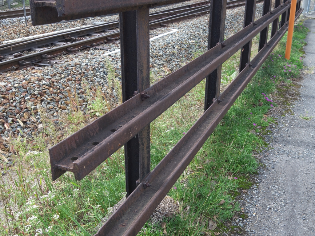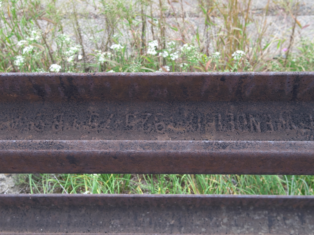 この遊歩道の横にも古そうな廃レールを利用した柵があります。よく観察すると刻印のあるレールも混ざっているのですが、サビか塗装で埋まってしまっていて今ひとつ鮮明ではありません。