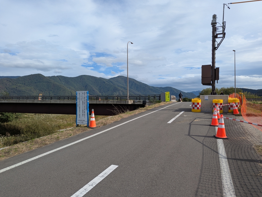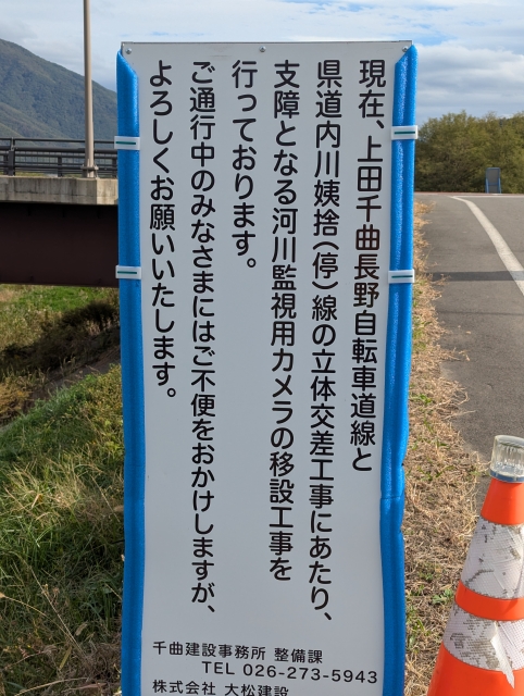 久々に千曲川サイクリングロードを走ってみたところ、冠着橋の周辺で工事が進んでいました。冠着橋のある県道338号と千曲川サイクリングロードの交差点は現状では平面交差となっており、自転車道側が一旦停止して安全を確認した上で通行するという形になっています。これが自転車が県道をくぐって反対側に出る構造になるようです。
