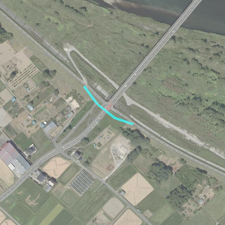 特記仕様書や平面図などの情報が公開されていたので、確認して出来上がりイメージを想像してみました。自転車道が若干堤内(川じゃない方)に緩く曲がった上で県道の下をくぐって再度自転車道に合流するという形になるようです。同じ千曲川サイクリングロード内だと松代大橋との交差とスタイルが近いかもしれません。