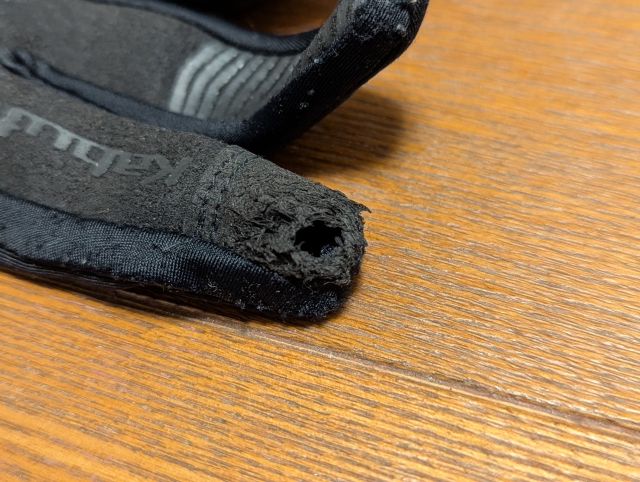 自転車に乗る時、今の時期はまだ薄手のロングフィンガーグローブを使っています。先日右手人差し指の先端に小さい穴が開いているのに気がつきました。1cmあるかないかくらいの小ささではありますが、外気が入ってきますしブレーキレバーに触れると冷たいので気になります。