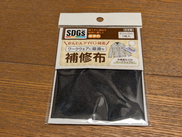 こちらが購入した補修布です。いくつかバリエーションがあり、チノパン用やTシャツ用もありました。今回は一番強そうな作業着用にしてみました。