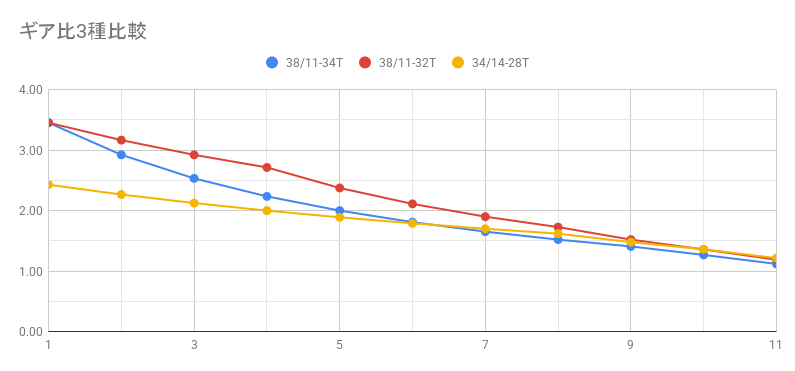 また、過去使っていたギア比と比較してみるとこのようになります。