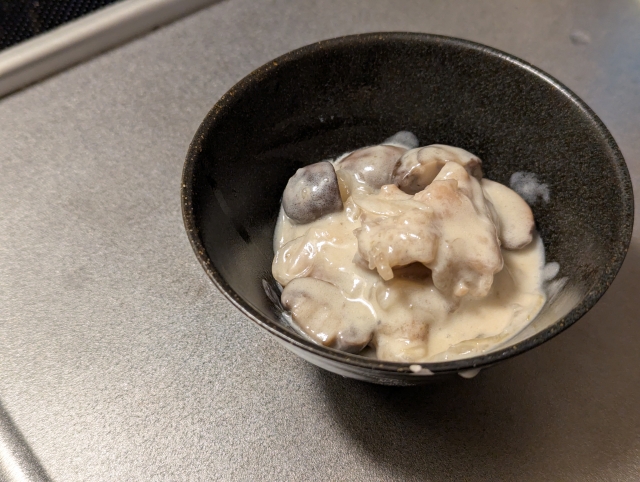 鶏肉とキノコ類、刻んだタマネギを炒めてある程度火が通ったところで水を加え、塩こしょうで味を調えて5分ほど煮ます。最後に生クリームを加えてなめらかな感じに仕上げます。煮る時の水を少なめにするのがポイントです。