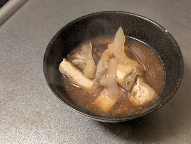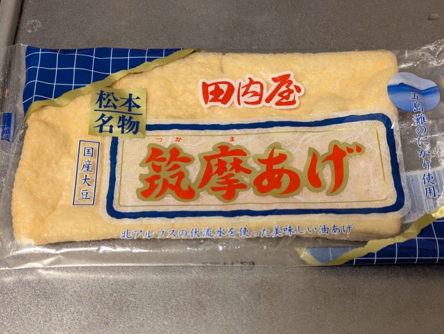 田内屋 筑摩揚げ コメントを残す 長野県のご当地油揚げを発見しました。 ちょっと大きめサイズの油揚げです。パッケージは珍しい1枚入りですが、1枚のボリュームが結構あり、包装込みで重量は150gありました。 切ってみると中の豆腐の層がかなりしっかりしています。油揚げの平均がどのくらいかは分かりませんが、明らかに肉厚な部類だとは思います。 結構しっかりした存在感がある油揚げなので、きのこ汁の具材として使ってみました。写真でも分かるとおり豆腐の層が分厚く、高密度です。きのこ共々おいしくいただきました。
