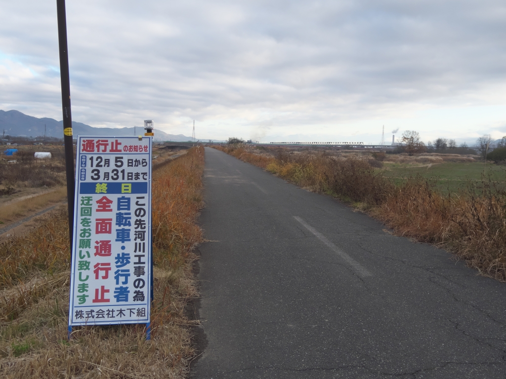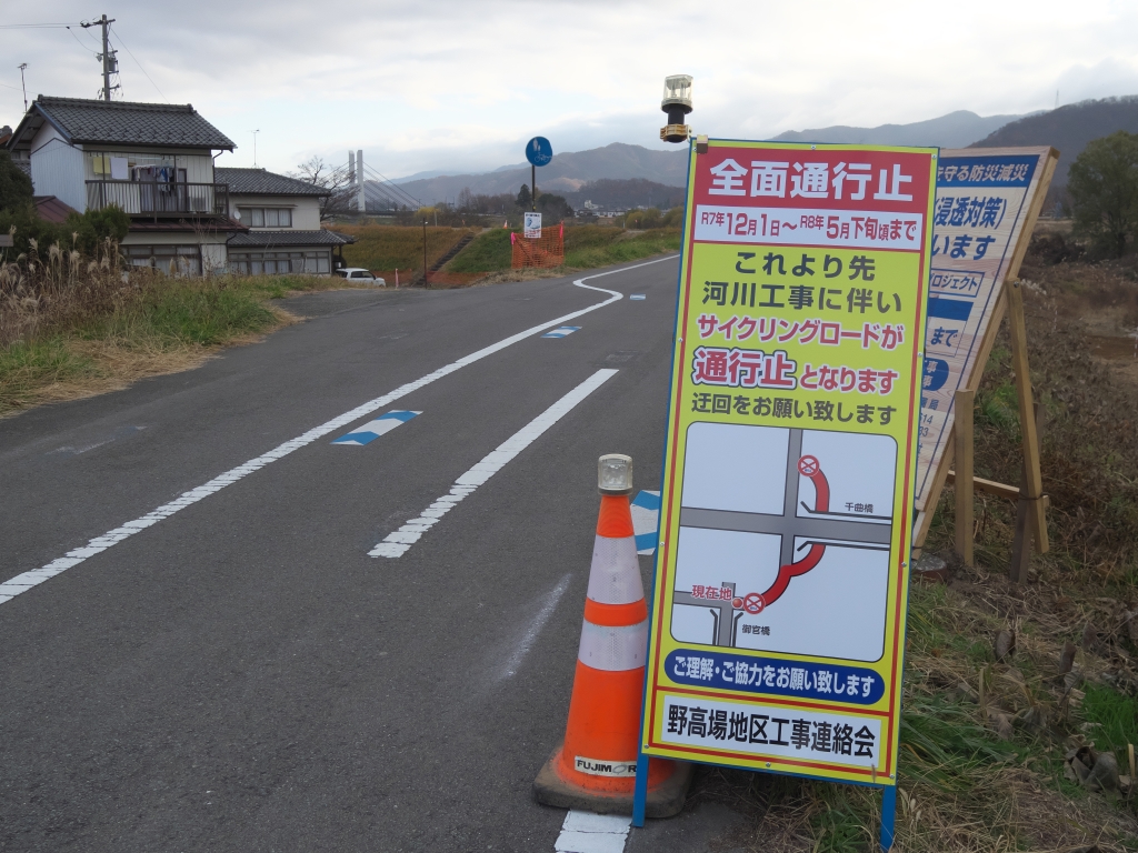 千曲川サイクリングロードに新しく通行止め予告が出ていました。今回は区間・期間とも結構長いので対策が必要そうです。