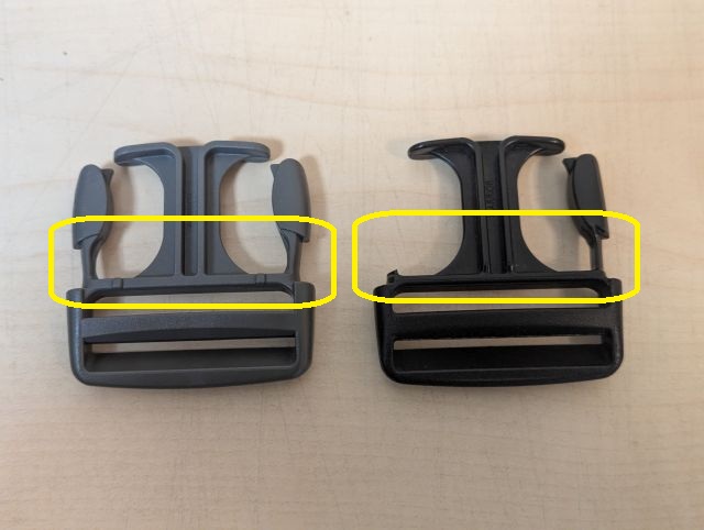 寸法もおおよそぴったりだったのでこれで完全に修理ができました。同じ製品のはずなのに寸法がおおよそぴったりとはどういうことかというと、製造ロットや世代の違いなのか、今回購入したバックルのパーツと壊れたバックルのパーツを比べてみると、ほとんど同じなのですがわずかに違いがあります。