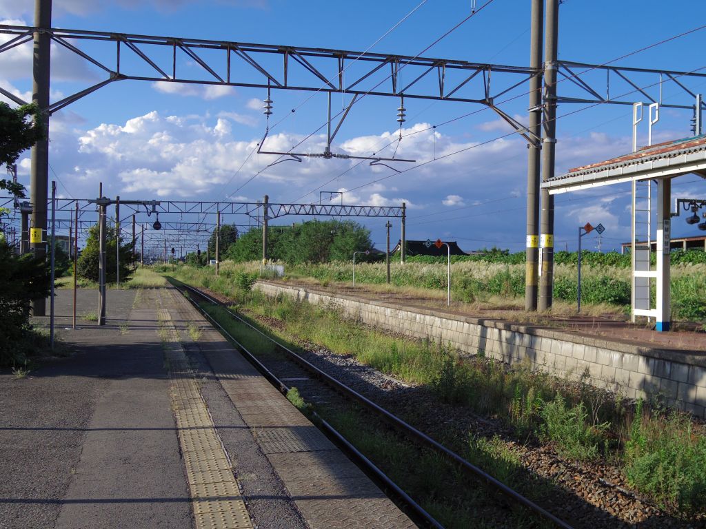 代行バスに乗り換えた余目駅は羽越本線と陸羽西線が乗り入れている駅です。写真の通り羽越本線(手前側)は列車の運行があるので線路もきれいですが、陸羽西線(奥側)は線路の上にまで背の高い草が生い茂っていて、果たしてここから復活できるのか心配になった記憶があります。