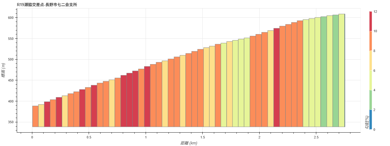 支所のある場所の標高は約600m、登り口の国道19号の交差点は400m弱なので200mほどの高低差があります。距離は2.5kmほどなので全体的に勾配は厳しめです。